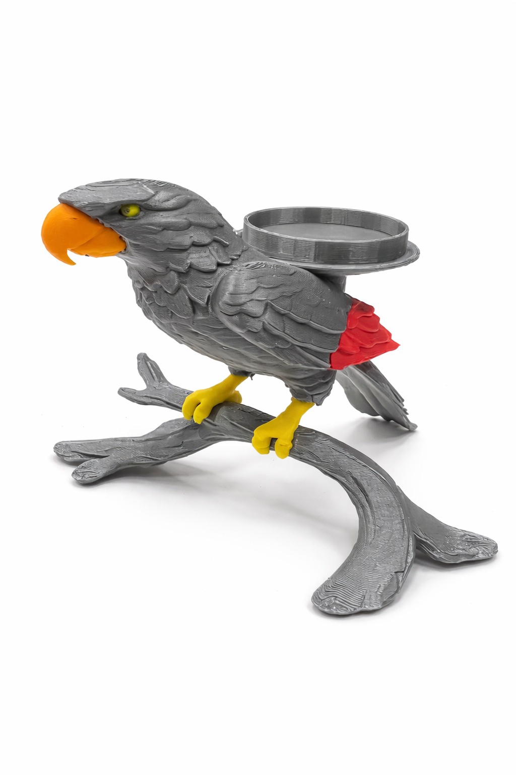 Add bold character to your space with this 3D printed African Grey Parrot tealight holder. Measuring 5 1/4″ wide, 3 1/2″ tall, and 5″ long, this detailed PLA bird sculpture holds a standard tealight and makes a unique shelf or desk accent for bird lovers and decor enthusiasts alike.