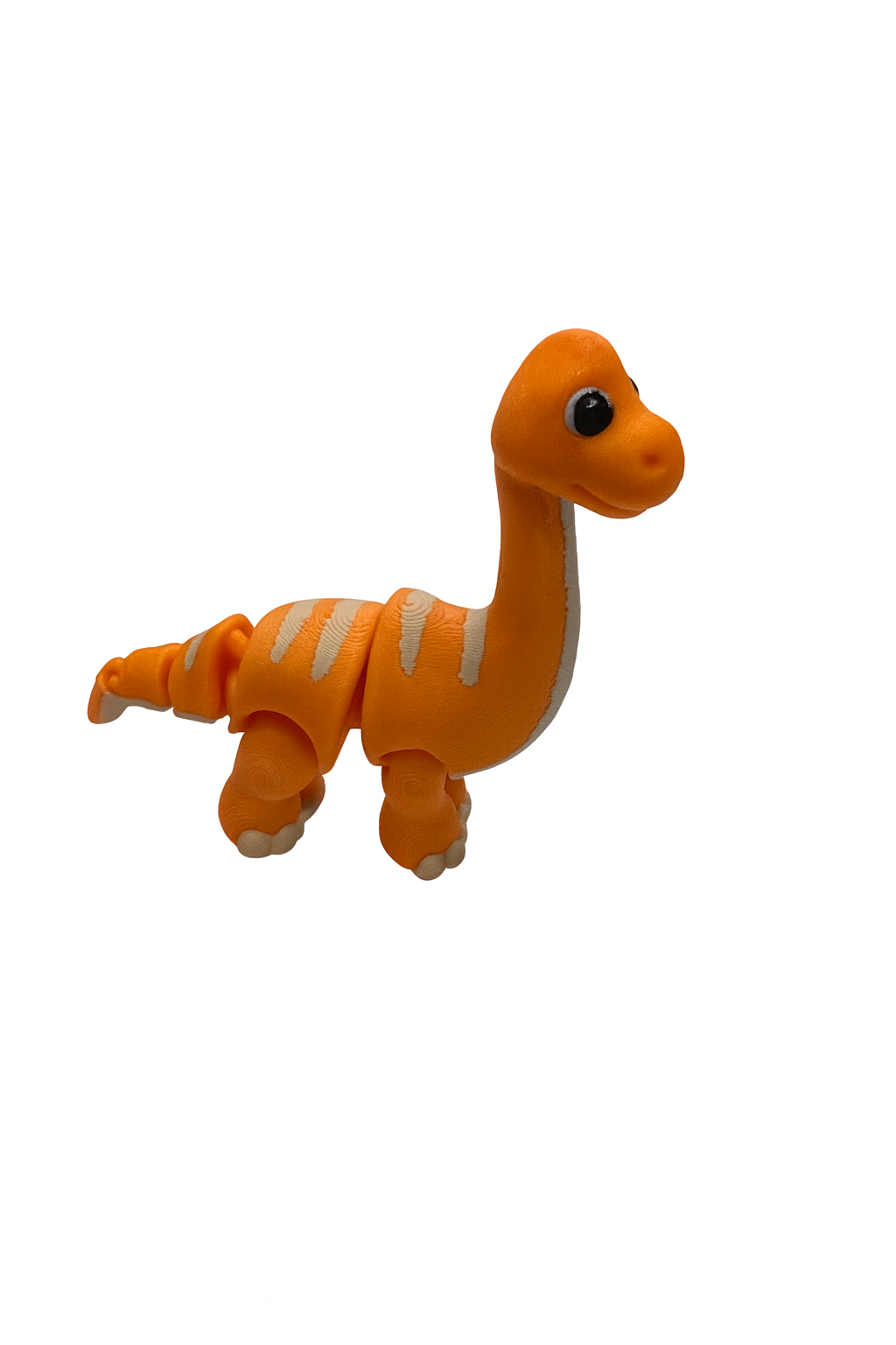 Each Brachiosaurus is 3D printed using high-quality PLA filament, showcasing its bright orange body accented with cream-colored stripes. Because every piece is handcrafted and printed individually, minor imperfections and slight color variations may occur — adding to its unique, one-of-a-kind character. No two dinosaurs are exactly alike, making yours truly special.