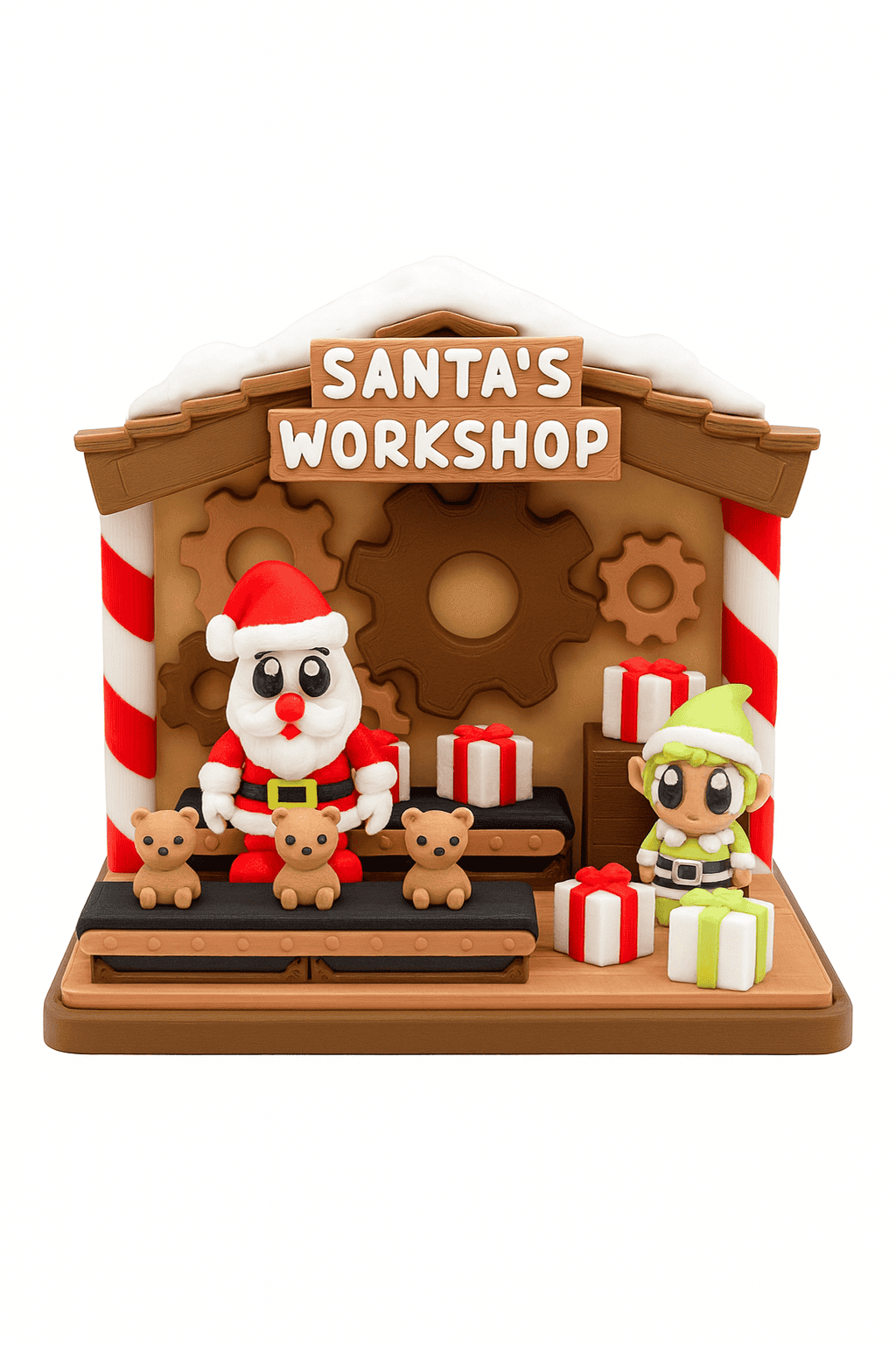 Bring the magic of Christmas to life with this adorable Santa’s Workshop 3D-printed diorama! This festive scene features Santa and his Elf as fully articulated, bears standing inside a charming workshop filled with gears, conveyor belts, teddy bears, and colorful gift packages.